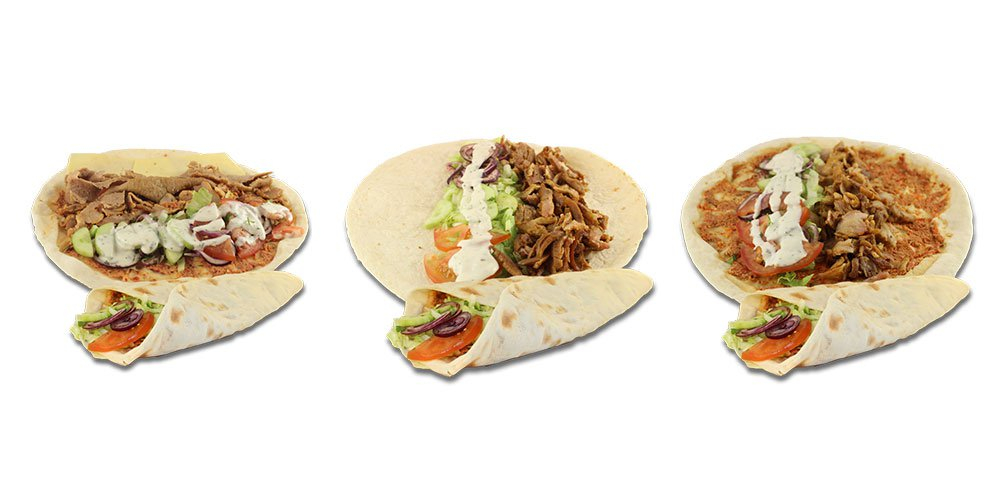 met shoarma, doner en doner kip met pitabrood of turks brood, salade, saus, patat of gekruide aardappelen.