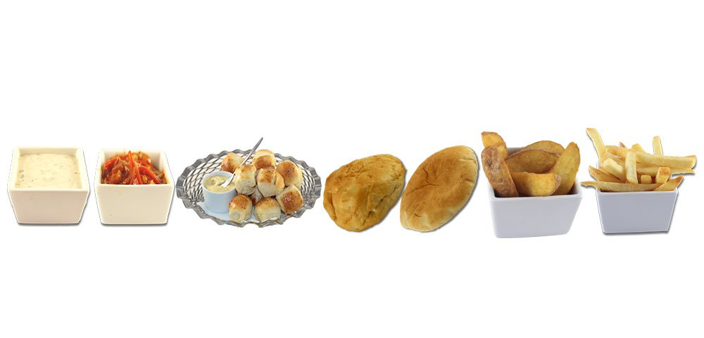 met pitabrood of turks brood, salade, patat of gekruide aardappelen en twee soorten saus naar keuze